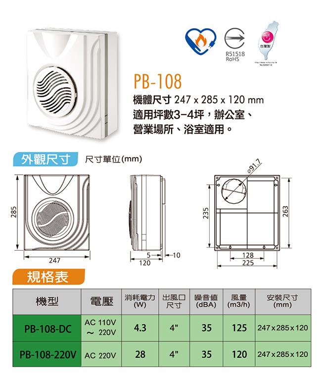 PB-108香格里拉牆壁換氣扇 尺寸:247×285×120mm 規格如圖所示。 1.風扇馬達為AC : 滾珠軸承蔽極式馬達。DC直流電無刷馬達,省電,高效能,採用日本設計馬達。 2.風扇...